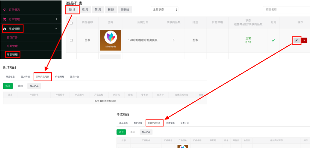 1.新增商品,【商品信息】、【关联产品列表】、【运费计价】这三个是必填项。新增/修改商品时可以选择关联产品(关联的产品类似于某种商品不同颜色或不同型号的合集);【运费计价】的设置在【商城管理-其他设置】中。