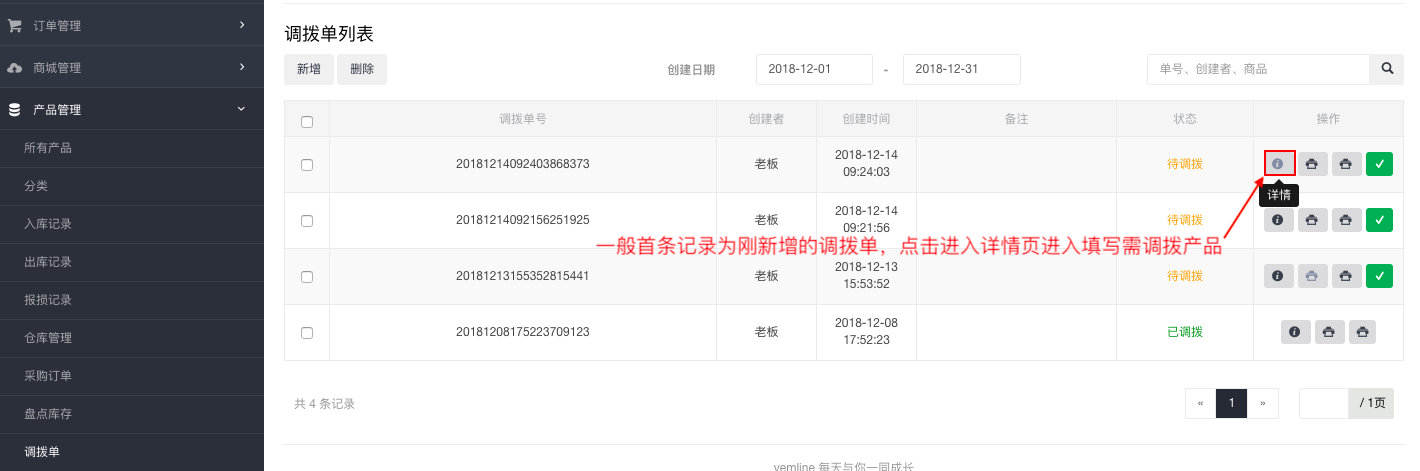 b.找到刚新增的调拨单进入详情页填写具体信息